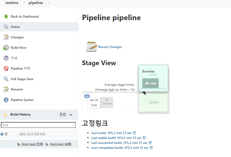 아까 스크립트에서 stage('Hello')가 파이프라인의 단계의 이름을 지정한 것이다