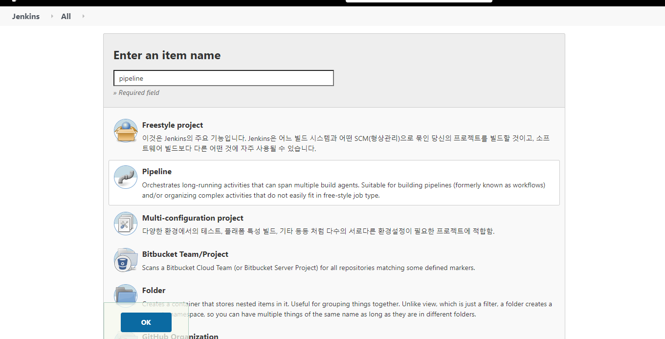 젠킨스 대쉬보드에서 새로운 Item (영어면 New Item)을 누르면 아래(↓)의 화면이 나온다